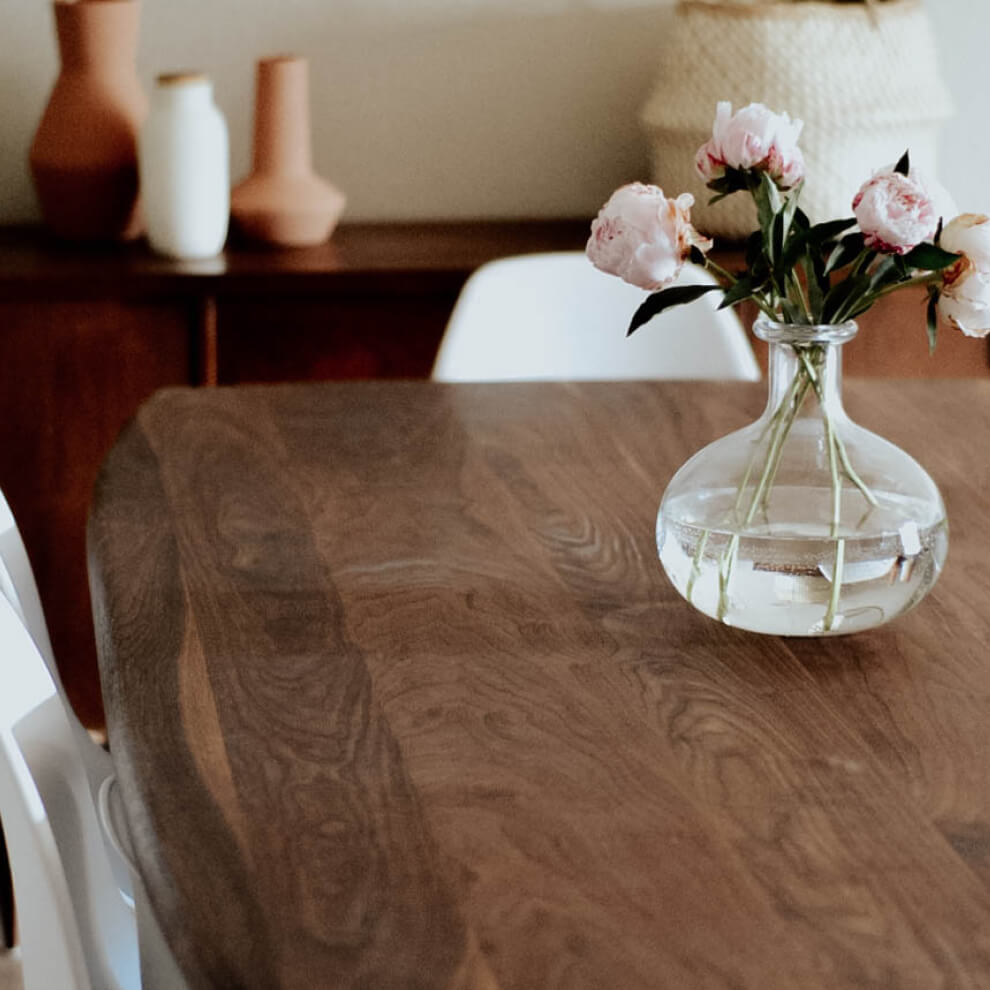 We're big fans of coasters and placemats, especially when you're setting down anything warm or damp, as natural wood is very sensitive to heat and moisture. To help prevent stains, apply a wood oil or wax as needed, but test first on a non-visible area.